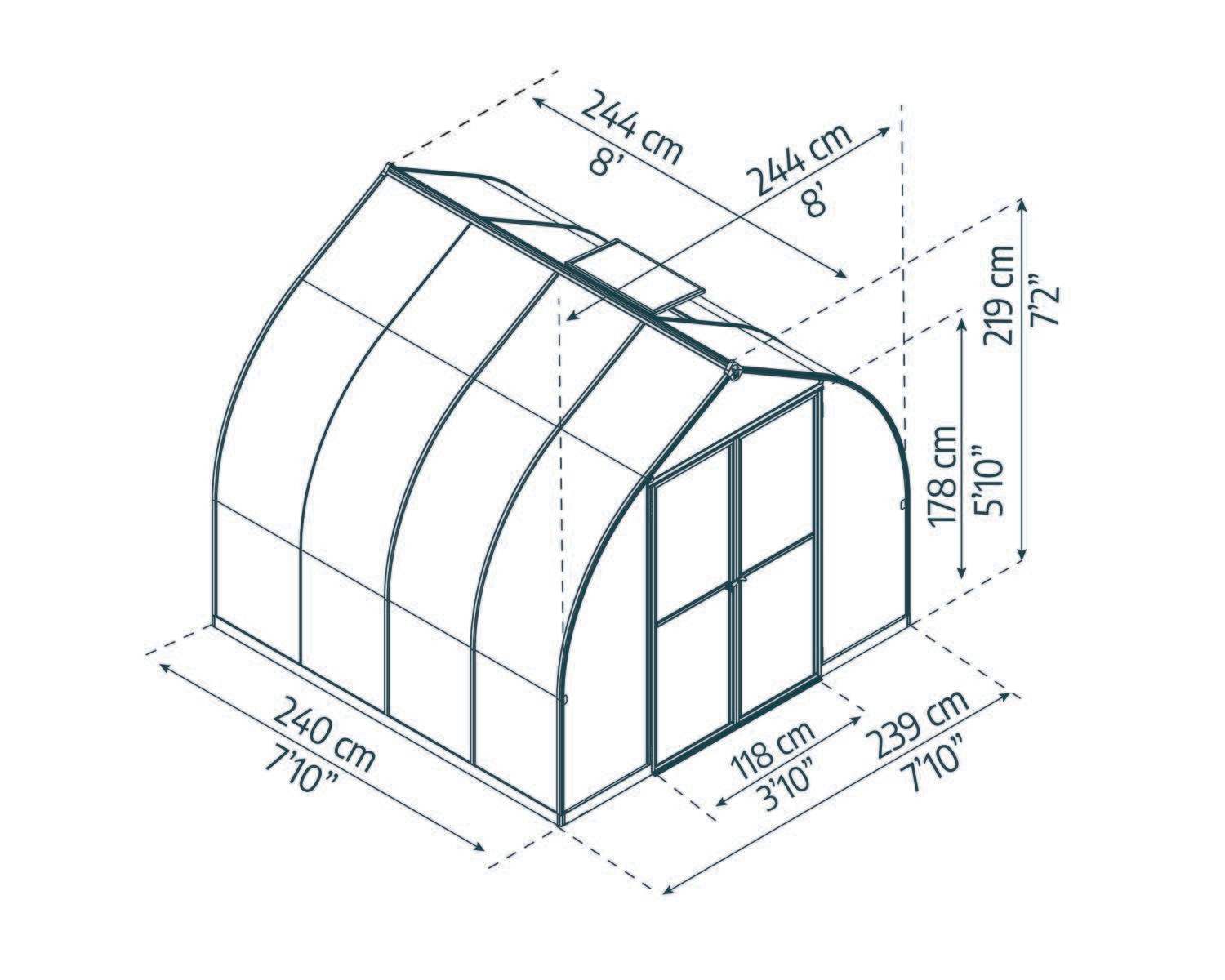 La serre de jardin Bella est une serre de jardin 8 pieds de large, belle et pratique, dotée de panneaux en polycarbonate alvéolaire pratiquement incassables, créant une combinaison idéale de diffusion de la lumière du soleil, d'isolation thermique et de sécurité pour tous vos besoins de jardinage. La serre de jardin en forme de cloche a été spécialement conçue pour améliorer la résistance au vent et permettre à la neige de glisser facilement. L'espace de travail extra-large et les larges portes doubles permettent au jardinier le plus passionné de cultiver une abondance de légumes et d'herbes aromatiques tout en ayant de la place pour transplanter les plantes tendres et pour ranger les outils et les accessoires. La serre de jardin en kit Bella comprend également une base périphérique en acier galvanisé, résistant à la rouille, pour un soutien structurel, une stabilité et un alignement supplémentaires. Achetez la serre de jardin Bella à monter soi-même dès aujourd'hui, pour une addition étonnante et fonctionnelle à votre expérience de jardinage.