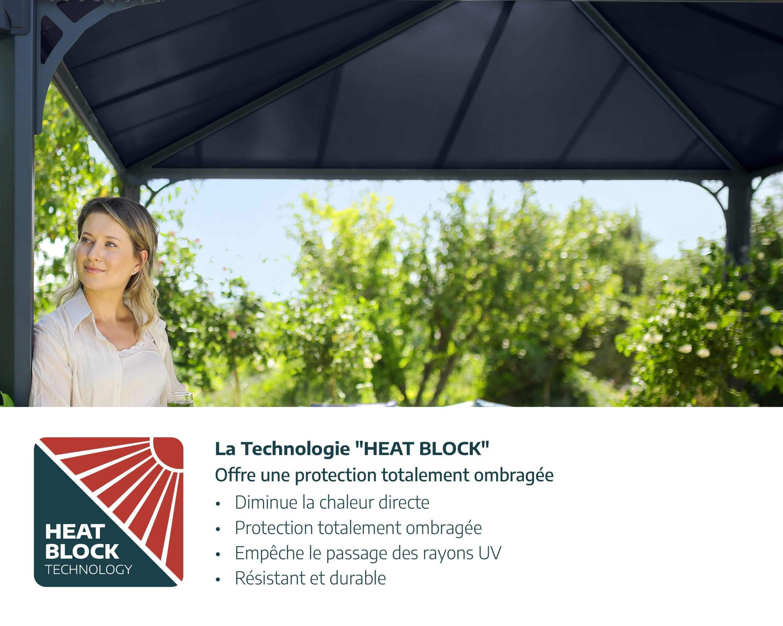 • Cette grande tonnelle possède les profilés de poteaux (18 cm) et les poutres (24 cm) en aluminium les plus épais du marché et seulement 4 poteaux pour plus d'espace.