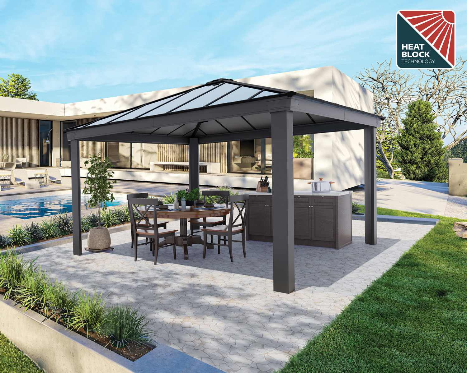 - Panneaux résilients : Les panneaux de toit gris opaque mat de 6 mm d’épaisseur sont dotés d’un vitrage totalement ombragé équipé de la technologie “Heat Block”, empêchant les rayons du soleil de passer à travers, ce qui rafraîchit et protège votre espace extérieur.