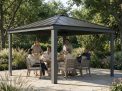 Imaginez profiter d’une escapade privée dans votre propre jardin. Créez un tout nouvel espace détente à l’extérieur avec notre tonnelle Dallas et elle deviendra le coeur de votre maison. L’espace de vie Dallas extra-large vous offre un sentiment d’intimité et vous procure un lieu ombragé que vous pouvez utiliser toute l’année. Ajoutez des lumières et un ventilateur (vendus séparément) et il deviendra à coup sûr l’endroit idéal pour vos réunions de famille, pour organiser un barbecue ou pour vous détendre dans votre spa en profitant de l’air frais et de la vue sur votre jardin. La tonnelle à toit rigide est doté d’un système de toiture présentant de nombreux avantages. Il est protégé contre les UV pour vous garder au frais les jours de chaleur, sans vis pour éviter les fuites, et il a une ventilation intégrée pour maintenir la circulation de l’air. Cette tonnelle très robuste est conçue pour durer grâce à la combinaison d’un cadre en aluminium résistant à la rouille et de panneaux de toit en polycarbonate pratiquement incassables, vous protégeant ainsi des effets nocifs du soleil pour de nombreuses années de plaisir. Profitez du bonheur de la vie en plein air !
