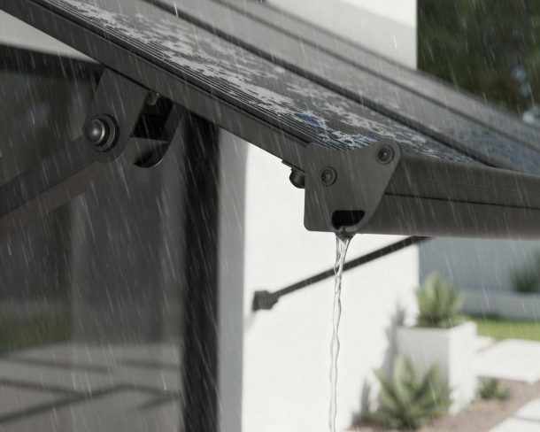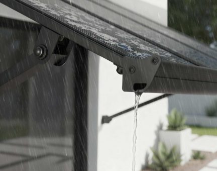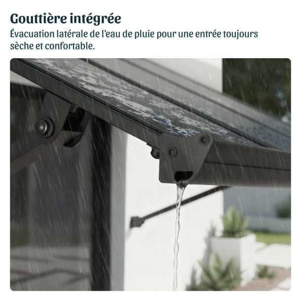 - Système de gouttière intégré : La gouttière frontale en aluminium dirige l’eau de pluie sur les côtés.