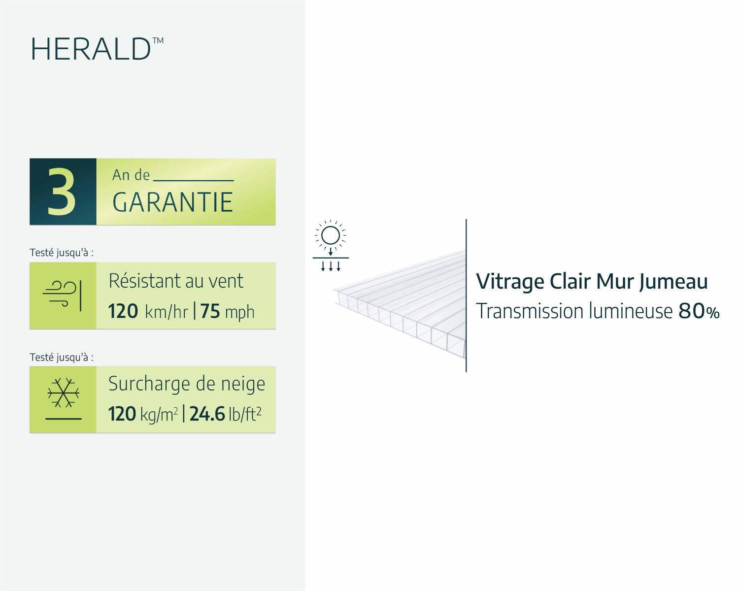 - Résistance aux intempéries tout au long de l’année : Résistance au vent, à la neige et à la grêle. Tested to withstand winds up to 120 km/hr. and 120 kg/m² of snow.
