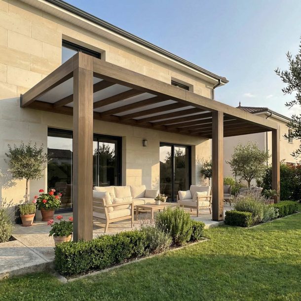 - Une pergola au design moderne : La grande pergola en bois offre un design épuré dans un matériau chaleureux.