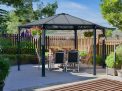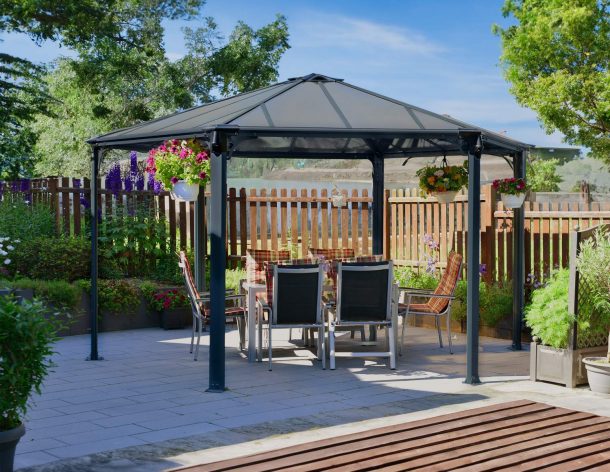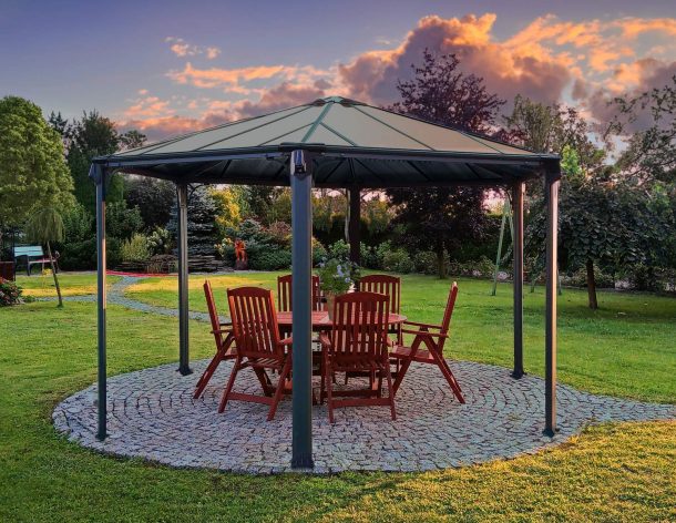 Tonnelle de jardin hexagonale Monaco 3.9X4.5 (13m²) Structure aluminium grise & toiture polycarbonate