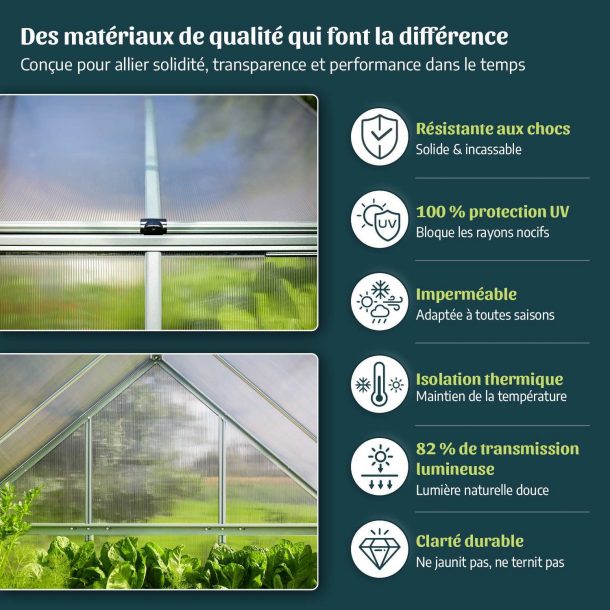 La garantie de toutes nos serres de jardin est d'au moins 5 ans, certaines plus. Les panneaux en polycarbonate monocouche ou alvéolaire, d'une transparence cristalline, conservent leur intégrité, ne se décolorent pas, ne se ternissent pas, ne se brisent pas et ne se fragmentent pas au fil du temps.