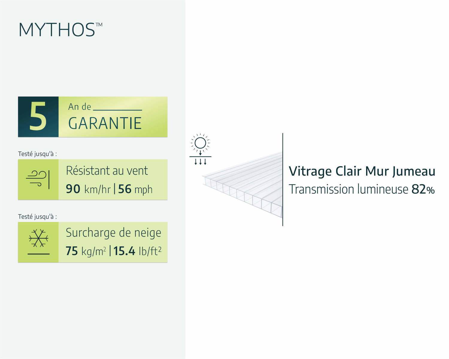Les panneaux muraux et de toiture Mythos sont fabriqués dans un polycarbonate pratiquement incassable, qui laisse passer la lumière comme le verre, mais qui est plus léger, plus résistant et plus sûr. Les doubles parois diffusent la lumière intense du soleil, qui peut stresser les plantes et freiner leur croissance, et assurent une rétention de chaleur deux fois plus importante que des panneaux individuels pour un environnement stable.