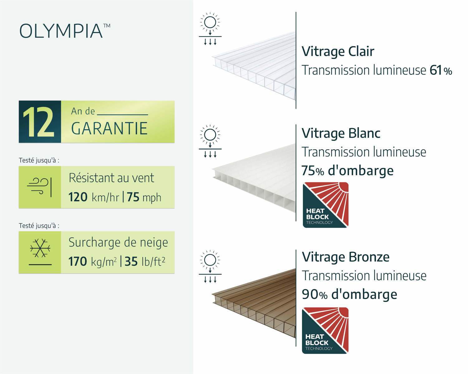 - Vitrage en polycarbonate résistant à vie ; ne se casse pas, ne se fragilise pas et ne jaunit pas avec le temps