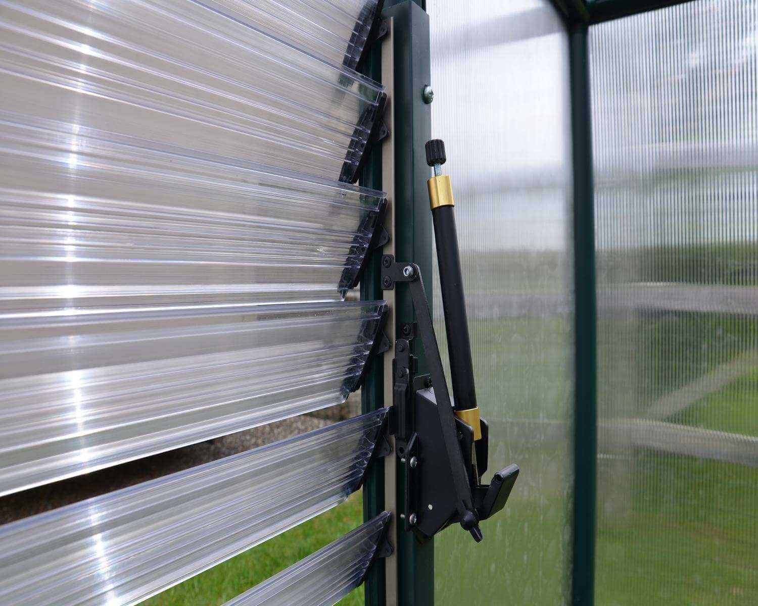 L’ouvre-fenêtre latéral automatique à lamelles est conçu pour contrôler automatiquement la température et fournir une ventilation supplémentaire dans les serres de jardin Palram – Canopia équipées d’une fenêtre à lamelles latérales. Lorsque l’air de la serre de jardin se réchauffe, l’évent s’ouvre progressivement pour laisser entrer la bonne quantité d’air dans la serre et se ferme lorsque la température optimale est atteinte. Le bras de ventilation a été conçu avec de la cire qui se dilate sous l’effet de la chaleur et actionne un piston qui ouvre la fenêtre à lamelles lorsque l’air se réchauffe, puis se contracte lorsque l’air se refroidit et se referme à l’aide d’un ressort. L’ouverture automatique des stores fonctionne sans alimentation électrique.