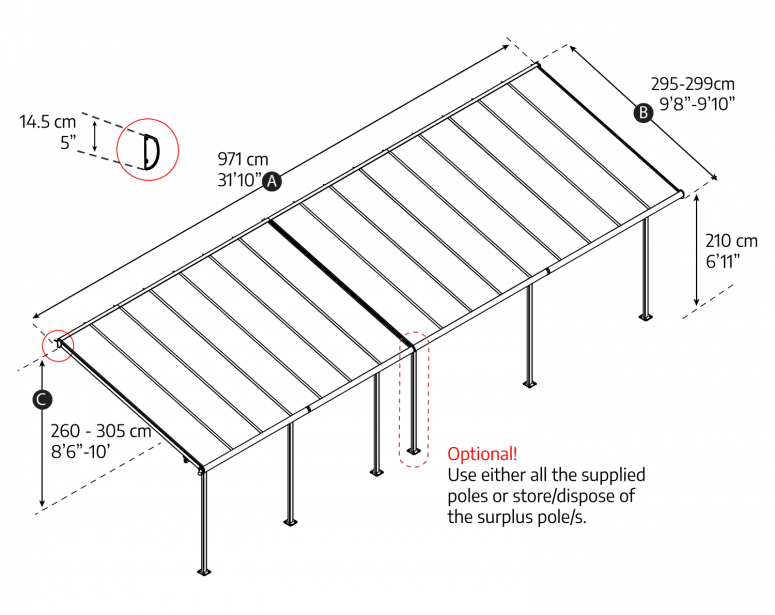 | C | Height | 260-305cm | 8'6"-10'pieds |
