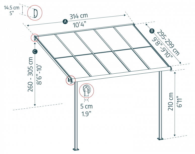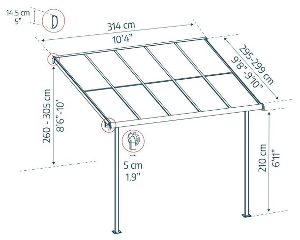 - Garantie : Abri de terrasse sans entretien, garanti 7 ans. Nous recommandons de vérifier les réglementations locales de construction avant l’installation. Assurez-vous également de poser l’abri sur une surface plane et stable avec une base solide.