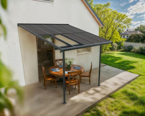 - Panneaux résistants : Les panneaux de toit gris opaques de 6 mm sont dotés de la technologie « Heat Block », offrant une protection solaire totale, réduisant la chaleur et préservant votre espace extérieur. Les panneaux en polycarbonate Canopia sont 100 % protégés contre les UV – ils ne jaunissent pas et ne deviennent pas cassants avec le temps.