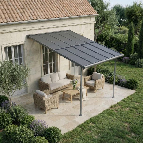 - Panneaux résistants : Les panneaux de toit gris opaques de 6 mm sont dotés de la technologie « Heat Block », offrant une protection solaire totale, réduisant la chaleur et préservant votre espace extérieur. Les panneaux en polycarbonate Canopia sont 100 % protégés contre les UV – ils ne jaunissent pas et ne deviennent pas cassants avec le temps.