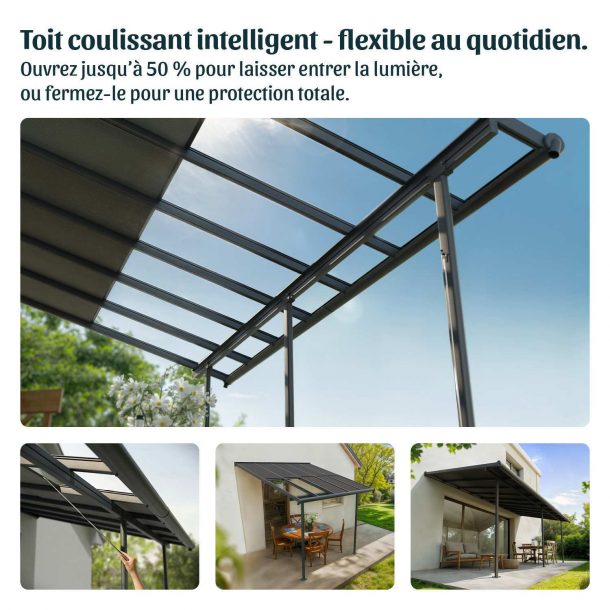 Le toit coulissant en polycarbonate peut être ouvert jusqu’à 50 %, vous permettant de réguler la lumière et