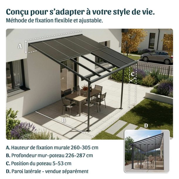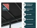- Garantie : Abri de terrasse sans entretien, garanti 7 ans. Nous recommandons de vérifier les réglementations locales de construction avant l’installation. Assurez-vous également de poser l’abri sur une surface plane et stable avec une base solide.