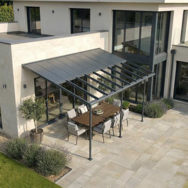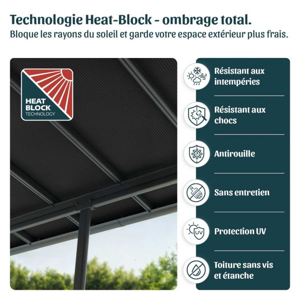 - Panneaux résistants : Les panneaux de toit gris opaques de 6 mm sont dotés de la technologie « Heat Block », offrant une protection solaire totale, réduisant la chaleur et préservant votre espace extérieur. Les panneaux en polycarbonate Canopia sont 100 % protégés contre les UV – ils ne jaunissent pas et ne deviennent pas cassants avec le temps.