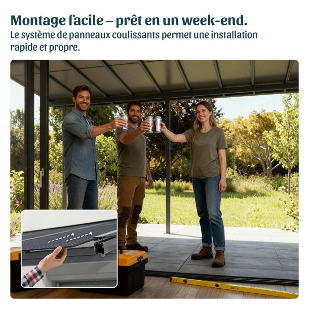Flexibilité exceptionnelle : profitez du soleil ou de l’ombre selon vos envies. Les lignes épurées et l’allure élégante de cet abri à panneaux coulissants ajoutent une véritable valeur esthétique à votre maison.