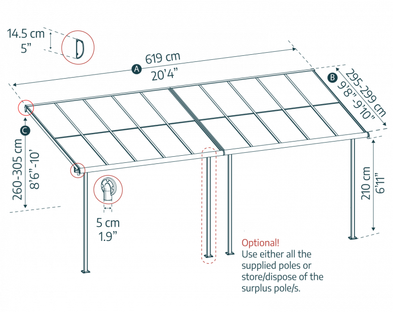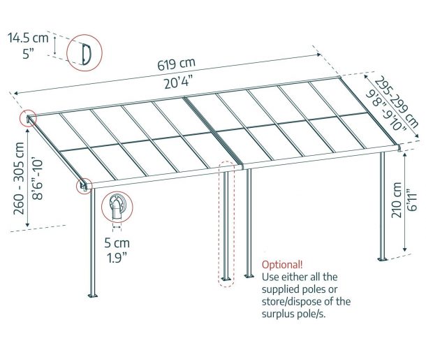 - Flexible et ajustable : Choisissez la hauteur, la distance au mur et l’écartement entre les poteaux pour une installation parfaitement adaptée à votre terrasse ou à votre véranda. Kit de platines inclus. Veuillez noter qu’une surface plane et solide ainsi qu’un mur porteur sont nécessaires à l’installation.