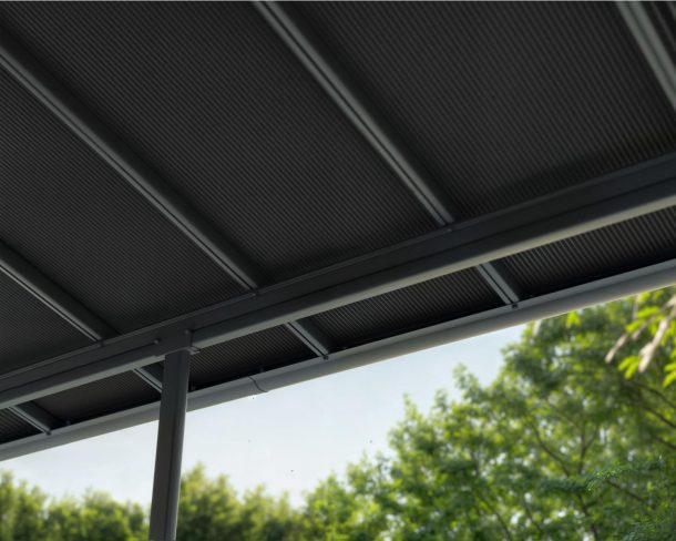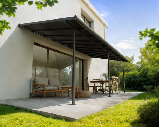 - Panneaux résistants : Les panneaux de toit gris opaques de 6 mm sont dotés de la technologie « Heat Block », offrant une protection solaire totale, réduisant la chaleur et préservant votre espace extérieur. Les panneaux en polycarbonate Canopia sont 100 % protégés contre les UV – ils ne jaunissent pas et ne deviennent pas cassants avec le temps.