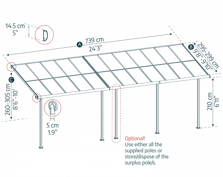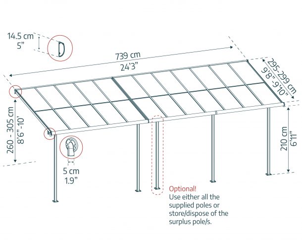 • Flexible et ajustable : Choisissez la hauteur, la distance au mur et l’écartement entre les poteaux pour une installation parfaitement adaptée à votre terrasse ou à votre véranda. Kit de platines inclus. Veuillez noter qu’une surface plane et solide ainsi qu’un mur porteur sont nécessaires à l’installation.