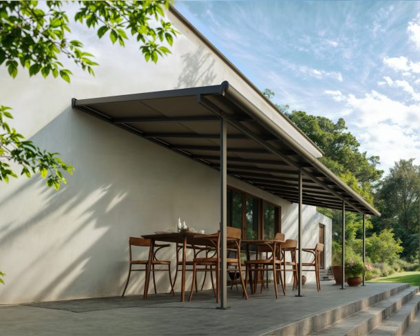 Profitez de la couverture idéale avec l’abri de terrasse Sierra Cabrio. Son design moderne à panneaux coulissants apporte une touche contemporaine à votre espace extérieur, tout en s’intégrant parfaitement au style de votre maison. L’abri de terrasse Canopia Cabrio vous permet de contrôler la lumière du soleil et la circulation de l’air, tout en offrant ombre, ventilation et protection complète contre la pluie. Le Cabrio associe la solidité d’un abri en polycarbonate à la flexibilité d’un toit coulissant, pour vous offrir le confort d’une véranda et la praticité d’un auvent. Profitez de votre terrasse par tous les temps – entre amis ou lors d’un moment de détente en plein air. En été, protégez-vous des rayons UV ou laissez la fumée du barbecue s’échapper – le toit coulissant s’ouvre et se ferme facilement à l’aide d’une tige.