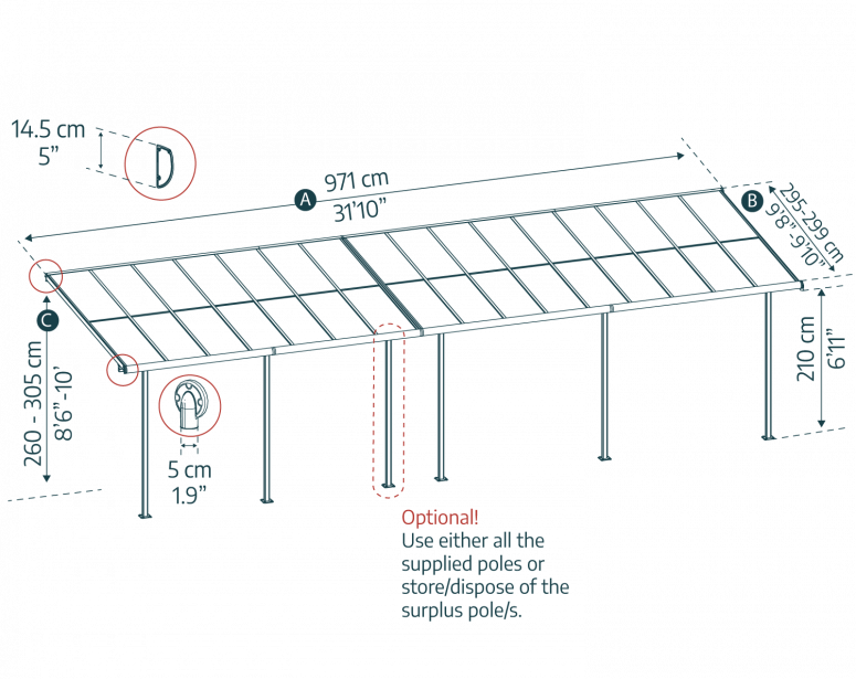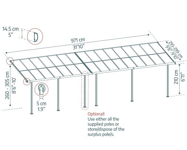 - Flexible et ajustable : Choisissez la hauteur, la distance au mur et l’écartement entre les poteaux pour une installation parfaitement adaptée à votre terrasse ou à votre véranda. Kit de platines inclus. Veuillez noter qu’une surface plane et solide ainsi qu’un mur porteur sont nécessaires à l’installation.