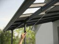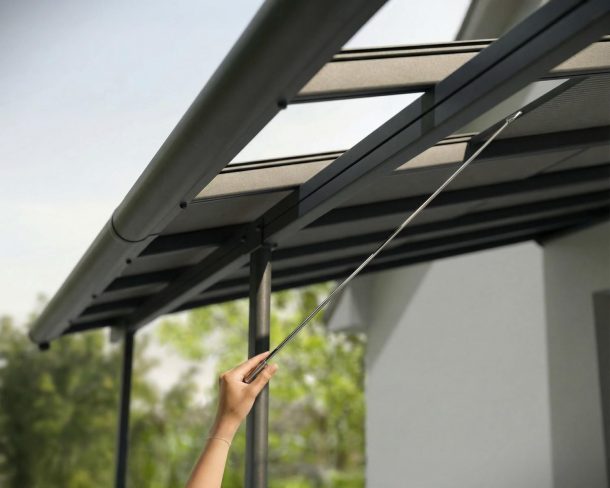 Les panneaux de toit sont installés sans vis, ce qui évite les fuites.Le toit coulissant en polycarbonate peut être ouvert jusqu’à 50 %, vous permettant de réguler la lumière et l’air pour une ombre agréable, une bonne ventilation ou une protection complète contre la pluie. Le toit s’actionne facilement et rapidement à l’aide d’une tige.