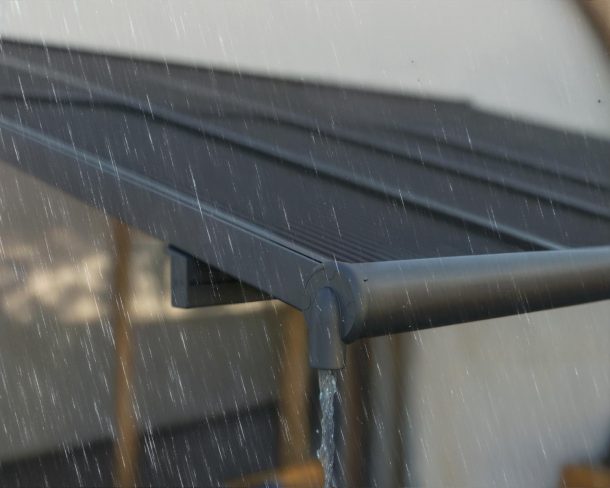 - Restez au sec Deux gouttières réglables intégrées (5 cm) dirigent efficacement l’eau de pluie. Le système d’assemblage sans vis empêche les infiltrations d’eau ou de condensation.