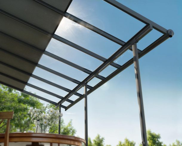 - Panneaux résistants : Les panneaux de toit gris opaques de 6 mm sont dotés de la technologie « Heat Block », offrant une protection solaire totale, réduisant la chaleur et préservant votre espace extérieur. Les panneaux en polycarbonate Canopia sont 100 % protégés contre les UV – ils ne jaunissent pas et ne deviennent pas cassants avec le temps.
