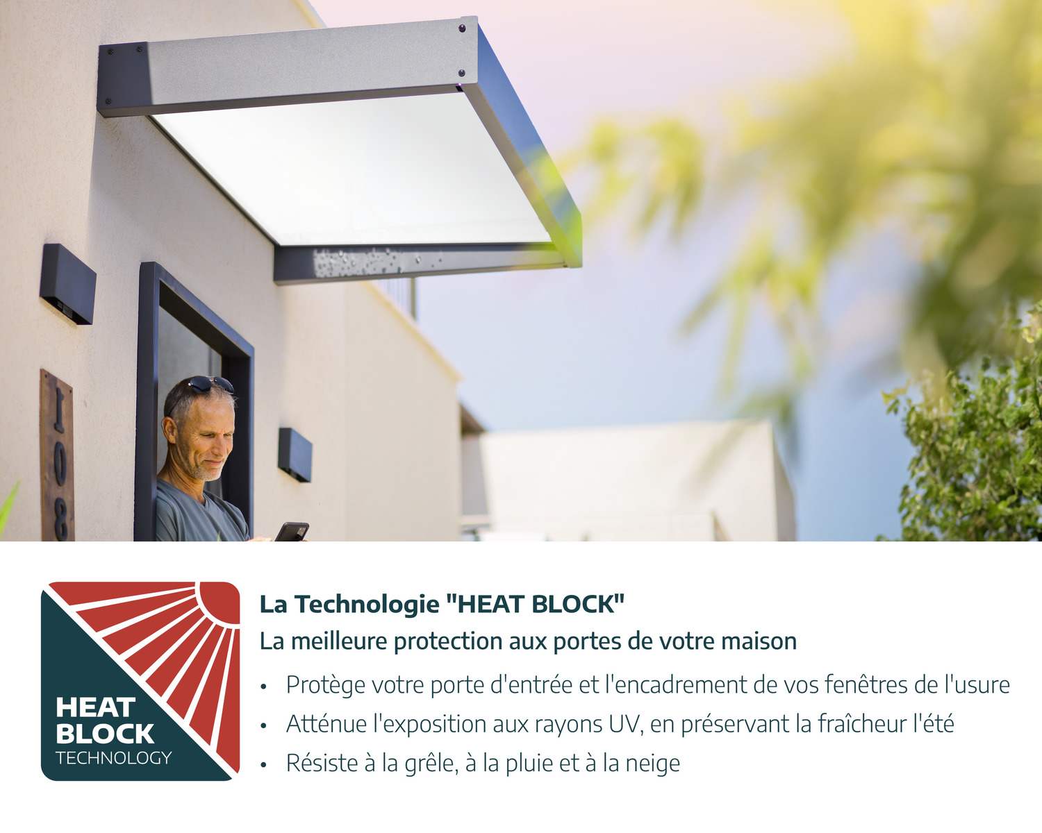 - Technologie Heat Block : Les panneaux en acrylique blanc opale de 4 mm, ultra-sûrs et très résistants, sont dotés de la technologie Heat Block qui réduit les rayons UV nocifs et protège votre entrée.