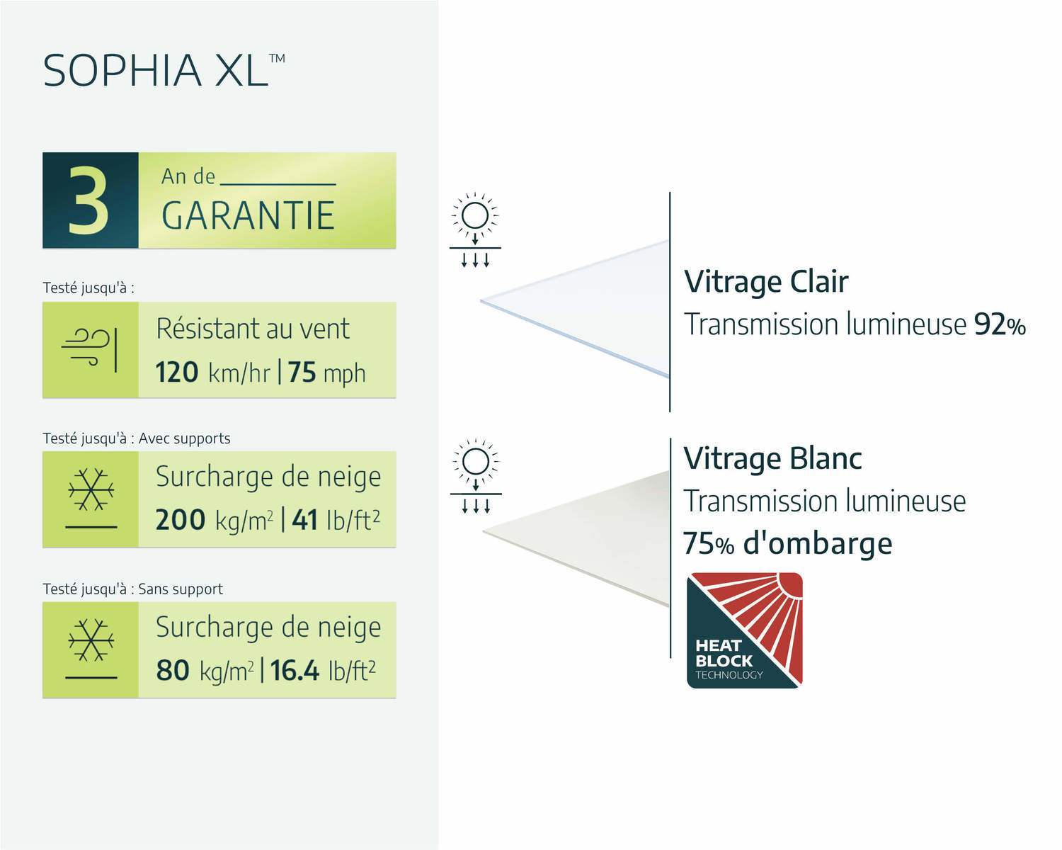 - Résistance aux intempéries tout au long de l’année: Résistant au vent, à la neige et à la grêle. Résiste à des vents allant jusqu’à 150 km/h et à 93 kg/m² de neige.